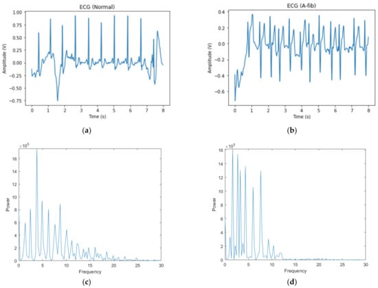 Raw data. (a) Normal ECG signal; (b) A-fib ECG signal; (c) power spectra of the normal ECG signal; (d) power spectra of the A-fib ECG signal.
