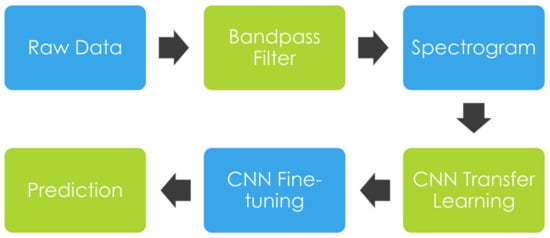 The raw ECG signals, after the pre-processing step, are converted into image representations using a spectrogram. Subsequently, the image inputs are fed into a CNN model for fine-tuning, as indicated in Figure 3. A detailed description of our methods and implementation is presented below.
