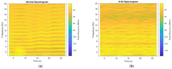 Spectrograms obtained from (a) a normal sample; (b) an A-fib sample.