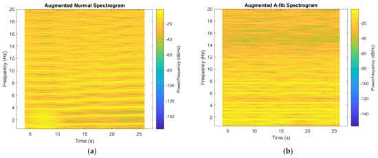 Augmented spectrograms obtained from (a) a normal sample; (b) an A-fib sample.