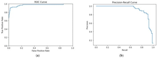 Our model was evaluated with a test set containing a total of 592 samples. As seen in Table 2, the model outputs 59 true positives, 11 false positives, 514 true negatives, and 8 false negatives, with an accuracy of 96.79%, and precision and recall of 84.29% and 88.06%, respectively, resulting in an F1 score and MCC of 86.13% and 84.34%, as summarized in Table 3. Figure 7 shows the PR curve and the ROC curve with its AUC computed as 95.34%. Due to class imbalance, PR curve can be a better visualization of model performance than the ROC curve [], so we present both plots in Figure 7 and verify that the PR curve, on top of the ROC curve, also shows a good model performance, despite class imbalance. The area under the PR curve (AUC-PR) is computed as 92.21%.