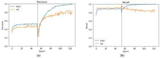 The precision and recall metrics over each learning epoch between the training and validation sets are shown in Figure 8. At the end of the training, the training set has a precision of 98.86%, a recall of 100.00%, and an MCC of 98.53%; the validation set has a precision of 83.17% a recall of 85.71%, and an MCC of 79.10%. From Figure 8, we observe that the transfer learning stage has a fairly high recall and a much lower precision, and the fine-tuning process is significantly improving the precision at a slight expense of recall for the validation set. The validation recall curve fluctuates little after epoch number 60 and is maintained above 80%. On the other hand, as the training precision curve approaches perfection, the validation precision curve maintains on the rise with its dips growing higher. Therefore, we experimented with a larger EfficientNet model, B1, but the performance metrics are inferior to those obtained from our B0 model. Table 3 also lists the model performance on the augmented dataset, and except for a slightly higher precision, AUC and AUC-PR, other metrics are inferior to those of the B0 model. Considering the extra computational time and resources on a dataset double the size for no significant improvement on model performance, we chose to only use the first set of spectrograms.