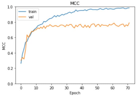 For our B0 model, the MCC value over each epoch in the fine-tuning stage for both training and validation sets are plotted in Figure 9. We can observe that both scores are increasing throughout the iterations and the early stopping criteria on MCC gives us the maximum validation MCC (79.10%) with the training MCC at 98.53%, as indicated above.
