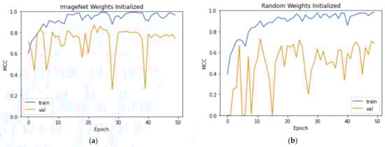 Instead of utilizing (i) transfer learning and fine-tuning (TL-FT) in a sequential process, we also experimented with (ii) transfer learning as weights initialization (TL-WI) and (iii) using random weights initialization (RWI) with the same EfficientNet B0 model architecture. The TL-WI approach uses the EfficientNet B0 model weights pretrained on ImageNet as starting values of the weights and trains the entire model from there. The RWI approach loads the EfficientNet B0 model with random weights by setting weights = None in Keras. Both experiments involved no freezing of any layer, and as we evaluated the model with the validation set after each training epoch, we saved the model with the maximum validation MCC over 50 epochs as the final model for each experiment. A learning rate of 0.001 was used, and other settings remained the same as those in TL-FT. A comparison of the results is illustrated in Section 3.3.