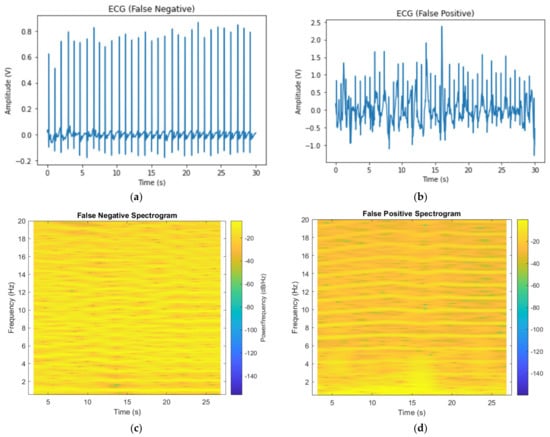 Examples of incorrect predictions: (a) False-negative ECG signal; (b) false-positive ECG signal; (c) false-negative spectrogram; (d) false-positive spectrogram.