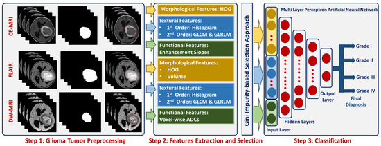 The proposed GG-CAD system (Figure 1) can discriminate between different grades of gliomas by performing the following steps: (i) extracting higher order 3D-appearance features from the segmented glioma tumor by constructing the histogram of oriented gradients (HOG) and estimating the tumor volume from both contrast-enhanced T1-MR and from T2-MR (FLAIR), (ii) calculating first and second order textural features from the segmented tumor based on constructing histogram, gray-level co-occurrence matrix (GLCM), and gray-level run length matrix (GLRLM) by utilizing contrast enhanced T1-MR and T2-MR (FLAIR) imaging, (iii) estimating functional features by estimating 3D ADC maps for the segmented tumor from DW-MR imaging acquired at the b-value of 1000 and calculating the amount of enhancement between pre- and post-contrast phases of T1-MR imaging, (iv) performing features selection using Gini impurity approach over the integration of all the aforementioned extracted features to get the most significant set of features, and (v) feeding the optimal set of features to a multi-layer perceptron artificial neural networks (MLP-ANN) classification model toward getting the final diagnosis of the tumor as Grade I, II, III, or IV.