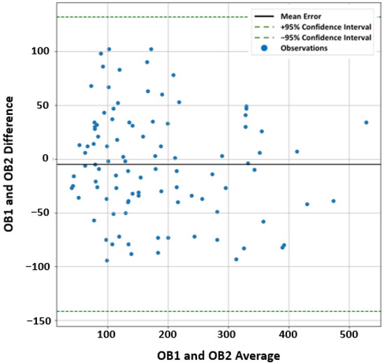 Bland-Altman mean-difference plot showing the agreement between the manual segmentation (extracted ROIs) performed by two observers (OB1 and OB2) blinded-from each other.