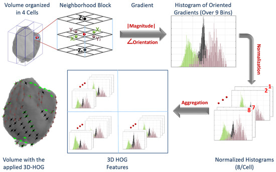 3D-HOG: The HOG descriptor is concerned with an object’s morphological structure/appearance finding a simplified image representation that only includes the most significant details about the image [35,36]. The HOG descriptor measures how frequent a gradient orientation occurs in a specific area of an object. In the proposed work, we applied a 3D-HOG approach over the volumes from the T2-MR (FLAIR) and pre- and post-contrast T1-MR. The extracted ROIs are resized to a new shape of (32 × 32 × Number of slices per volume). So, all the volumes have the same length (X) and width (Y), while the depth (Z) is the different dimension depending on the number of 2D slices of each volume. The resized ROI is passed to Algorithm 1 with the number of bins set to 9 and the number of cells set to 4. Finally, the HOG descriptor is formed. We have 4 cells, each cell has 8 histograms, and each histogram is generated over 9 bins. Hence, the total number of features are features for each volume. Figure 3 shows the different steps to applying the 3D-HOG approach.
