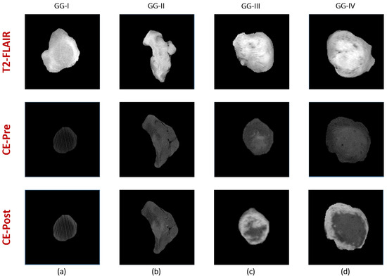 Visualization of texture differences between four gliomas with different grades (a) Grade I, (b) Grade II, (c) Grade III, and (d) Grade IV using contrast-enhanced T1-MR (pre and post phases) and T2-MR (FLAIR).