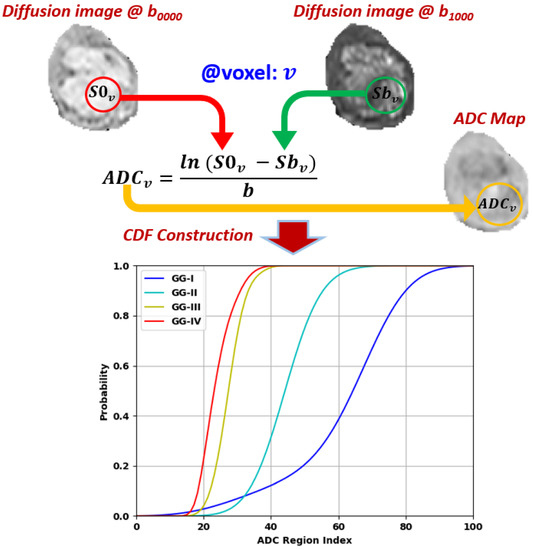 ADCs (DW-MR): The diffusion-weighted MR signal is affected by diffusion of water through the tissue and also by capillary perfusion. Pathological tissues, such as gliomas, are likely to have unusual diffusivity properties relative to surrounding healthy tissue. Hence, well-known functional parameters called apparent diffusion coefficients (ADCs) can be estimated from different gradient field strength and duration (b-value). Higher b-values produce greater attenuation of the DW-MR signal intensity. The voxel-wise ADC values [45] at a certain b-value can be calculated as shown in Figure 5. Subsequently, we set the b-value to 1000 and calculated ADC accordingly for each voxel within the segmented tumor. Using this set of ADCs directly as a descriptive feature is problematic, since every segmented region includes a different number of voxels. Therefore, we standardized the length of the descriptor by binning the ADC measurements and calculating their cumulative distribution function, or CDF (Figure 5).