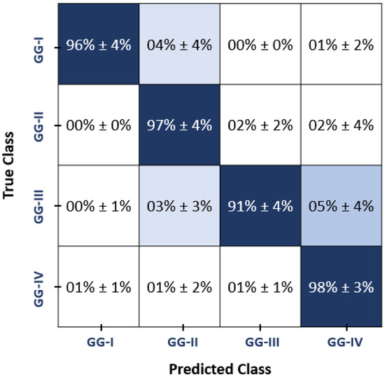 Experiment I: To evaluate the classification abilities of the hyper-tuned MLP-ANN model utilized in the developed GG-CAD system, the diagnostic results using the selected optimal set of features along with MLP-ANN were obtained. To demonstrate the generalization ability and reproducibility of the GG-CAD model, a favorable comparison is performed using the three aforementioned validation approaches. As documented in Table 3, the proposed GG-CAD system shows high and robust diagnostic performance using the three different validation approaches. The confusion matrix (in terms of accuracy) of the proposed model (utilizing MLP-ANN uisng LOSO cross-validation over the selected features) is shown in Figure 6.