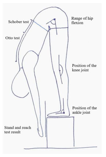 In assessing flexibility, the most frequently used tests are the sit and reach and the stand and reach tests (also known as the toe touch test). They are used in physical education lessons, in physiotherapy, in sports and as one of the elements of the evaluation of physical fitness of people of different ages. These tests are commonly available as they are easy and cheap to use [,,]. Research shows that these tests are accurate tools, and that their scores correlate with the range of motion of the lumbar spine, hip joint and the flexibility of the hamstrings []. The comparison between the sit and reach and the stand and reach tests shows no significant differences, since both tests produce similar results in the assessment of flexibility. However, surface EMG reveals that the activity of the lumbar spine extensor is higher in the stand and reach test []. In our research, we used the stand and reach test because it seems to be more functional. The forward bend motion while standing is made multiple times each day, as opposed to the forward bending motion while sitting.
