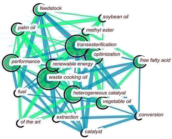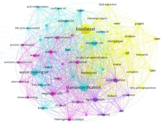 - For a more specific analysis of this research, keywords collected by the CiteSpace program were used. From a systematic verification of the terms, it was possible to observe that the main research topics in this area include oleaginous yeasts, ionic liquids, process design, oil extraction, enzymatic biodiesel production, and calcium oxide.