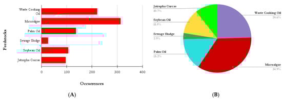 - Waste cooking oil and microalgae are the raw materials of most significant presence in the academic outputs analyzed. These are feedstocks that have been extensively reported on in the literature, mainly due to their long-standing reputation in the area. However, there has been a noticeable reduction in the volume of cited articles over the years.