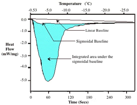 A typical DSC thermogram showing the latent heat release (area under the curve) using a linear and sigmoidal baseline. The integrated area (shaded region) under the sigmoidal baseline represents the magnitude of the latent heat released during freezing. Note that a negative value on the y-axis represents an exothermic reaction. Redrawn with permission from Devireddy et al. [].