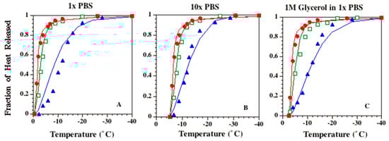 Figure 2A–C show the experimentally determined temperature dependence of latent heat release from 1 × PBS, 10 × PBS and 1M glycerol in 1 × PBS solutions, respectively. In each figure, the experimentally determined fraction of heat release at various sub-zero temperatures is shown: 1 °C/min (filled circles), 5 °C/min (open squares) and 20 °C/min (filled triangles). Note that the heat release profile of the 1 × PBS solution for a cooling rate of 1 °C/min is very similar to the release profile defined by the phase diagram for a water–NaCl binary solution (solid line in Figure 2A). Figure 2 also shows that the heat release profiles for 5 and 20 °C/min significantly lag behind the 1 °C/min profile for all three solutions studied. The constant “A” obtained by curve fitting to the 1 °C/min data was found to be 0.53 for all three solutions investigated (Table 2). Thus, the temperature dependence function shown in Equation (2), when applied to the 1 × PBS solution, is exactly the same as the one described previously by Hayes et al. [] for a binary (water–NaCl) isotonic solution. The solid lines in Figure 2B,C represent the temperature dependence function shown in Equation (2), with A = 0.53 for 10 × PBS (Tph = ~−5.3 °C or ~267.85 K) and for 1 M glycerol in 1 × PBS (Tph = ~−2.4 °C or ~270.75 K), and are shown to accurately predict the fraction of heat release measured at 1 °C/min.