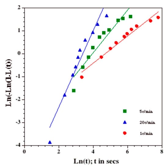 Figure 3 shows the plots of the 1, 5 and 20 °C/min data for the 1 × PBS solution, as previously suggested by MacFarlane et al. []. Equation (3) can be recast in the form: ln[-ln(1-β(t))]=ln(κ)+γ•ln(t), and thus, plots of ln[-ln(1-β(t))] against ln(t) should fall on a straight line when the transformation process follows the model, with the slope of the line being equal to the time exponent “n” and the y-intercept being equal to the natural log of the constant, k, or ln(k). Such a plot is shown in Figure 3 and shows that the 1 °C/min (filled circles), 5 °C/min (open squares) and 20 °C/min (open triangles) data points can be represented by three separate straight lines. Thus, Figure 3 suggests that the transformation process follows the Avrami-like model reasonably well and validates our choice of L(t) shown in Equation (3). The three straight lines from left to right represent lines with a slope of 1.5 (or the time exponent, n = 1.5). The 1 °C/min (filled circles), 5 °C/min (filled squares) and 20 °C/min (open triangles) data points are found to be reasonably well represented, even with the solid lines. The time exponent, n, was then set to 1.5 for two reasons: (1) it corresponds to the physical situation of the DSC experiment: i.e., at time t = 0, all nuclei are present or “site-saturated” [], and (2) as is shown later (Figure 4), the value of “n” that best fits the 1, 5 and 20 °C/min data concurrently was also found to be equal to 1.5 (the “combined best-fit” value of “n” was also found to be 1.5 for the other two solutions studied, as shown in Table 2 and Figure 4).