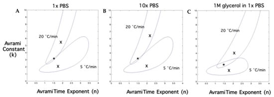 Contour plots of the goodness-of-fit parameter R2 (≥ 0.95) for the Avrami-like kinetic model. Figure 4A–C show the combinations of constant (k) and the time exponent (n) that fit the 5 and 20 K/min data for 1 × PBS, 10 × PBS and 1M glycerol in 1 × PBS solutions, respectively, with an R2 ≥ 0.95. Note that the contour plot for 1 K/min is completely enclosed by the contour plot corresponding to 5 K/min for all media (contour not shown in the interest of clarity). The “combined best-fit” parameters for 1, 5 and 20 K/min are represented by a star (*) in each figure and are: n = 1.5 and k = 3.3 for 1 × and 10 × PBS solutions and n = 1.5 and k = 2.3 for 1M glycerol in 1 × PBS solution (Table 2). The constant (k) is plotted on the y-axis, while the time exponent (n) is plotted on the x-axis.