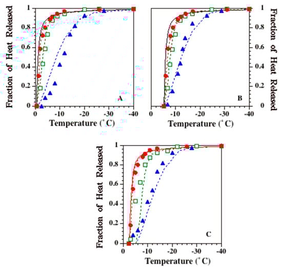Model simulations of L(T,t) using Equations (15) and (16). The three figures represent the three different concentrations of PBS (1 ×, 5 × and 10 ×). Each graph contains simulated (heat- and mass-transfer-diffusion-limited model) and experimental results from equilibrium cooling (phase diagram solution, solid lines), 1 K/min (filled circles), 5 °C/min (open squares) and 20 K/min (filled triangles). In each figure, the three curves (dotted lines), from left to right, represent the model-simulated fraction of heat release at 1, 5 and 20 K/min, respectively. In each figure, the experimentally determined fraction of heat release is shown on the y-axis, and sub-zero temperatures are plotted on the x-axis.