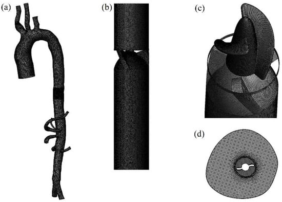 Ansys ICEM (ANSYS Inc., Canonsburg, PA, USA) was employed to generate a tetrahedral mesh with refinement of some geometric features, such as the curvature, outlet diameter, and branching. To capture the flow near the walls, five-layer prismatic meshes were employed as boundary layers. Their y pulse was approximately equal to 1, which satisfies the requirements for the solution of the SST k-ω turbulence model. All meshes in this study had skew angles greater than 30°, aspect ratios less than 1.5, and were without a negative volume. To ensure the accuracy of the calculation results, on the one hand, the inlet and outlet of the model were sufficiently extended (about 50-times the diameter), to avoid the influence of boundary conditions on the simulation results. On the other hand, grid-independent verification was employed, and important indexes of the study, such as each organ’s perfusion, shear stress, and so on, were observed as the mesh number increase or decrease; finally, a mesh number of 9 million (Figure 2) was chosen for the subsequent study, based on the consideration of simulation accuracy and simulation time.