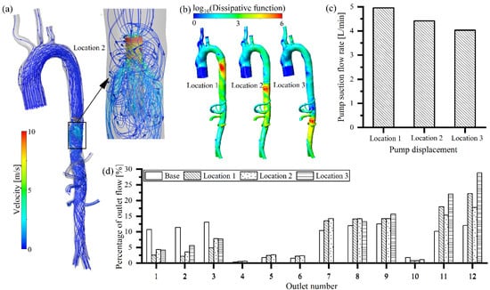 Effects of the different locations of the arterial intravascular pump on flow features: (a) effect on arterial flow field; (b) effect on pump suction flow; (c) effect on energy losses, and (d) effect on organ perfusion.