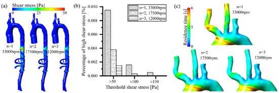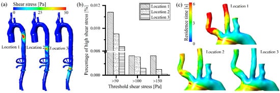 Effects of different pump positions on the blood damage-related parameters (shear stress and resident time): (a) effect on arterial shear stress distribution; (b) effect on high shear stress volume; (c) effect on residence time distribution.