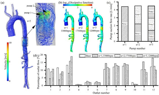 Effects of different numbers of arterial intravascular pumps on the flow features: (a) effect on arterial flow field; (b) effect on pump suction flow; (c) effect on energy losses, and (d) effect on organ perfusion.