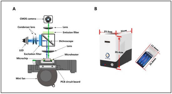 (A) Design and configuration diagram of the multiple fluorescent collection module. (B) Outlook and dimension of Real-time PCR Nucleic Acid Detection System SWM-02 and microchip BS-C3-12.