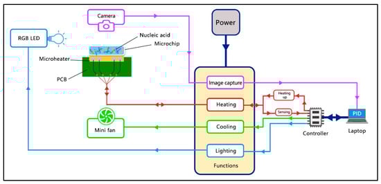 As shown in Figure 2, the multifunctional implementation of SWM-02 is based on the upper and lower control with python code-based software. A laptop and the controller serve as upper and salve machines, respectively. For more details, once we set up the thermal procedure in the software, the real-time temperature value is detected by the temperature sensor inside the microheater and collected by a controller. The temperature data is imported through communication interface transmission to the laptop computer for calculation and comparison with the setting value. Afterwards, an output command, including heating duration and cycle number, is transmitted to the controller to control the power distribution. As a result, the microheater and cooling fan would run or stop following the controller’s order, which makes the real-time temperature reach the target value. Similarly, the RGB (red, blue, and green), LED, and CMOS camera were operated during the signal collecting process according to the user setting. After completion of the reaction protocol, the data, such as temperature profile, fluorescence intensity and pictures at the endpoint of every cycle, would be saved and analyzed on the laptop.