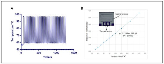 Thermal performance of the microheater. (A) Temperature profile in thermal cycling. (B) The linear relationship between electrical resistance and real-time temperature (R2 = 0.999) and patterned microheater with heating and sensor terminal.