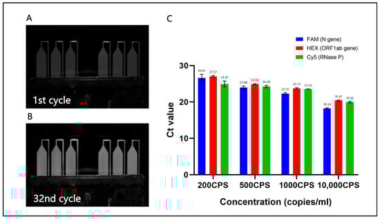 As shown in Figure 4A,B, there was a significant difference in fluorescent intensity between the beginning and last cycle of reaction using 1000 copies/mL reference sample, which means that PCR assay has been successfully performed in six microchambers. In the darkroom, the CMOS camera collects pictures at the grey level, and white brightness appearing in microchambers would be enhanced as the increase of marked amplicon. Figure 4C summarized Ct values of PCR with plasmid samples ranging from 200 copies/mL (CPS) to 10,000 CPS and Ct values obtained in three channels showed a declining tendency as the increase of sample concentration. Each diluted sample is tested three times for amplification of the target gene. Among 200 CPS of three specific sequences (N genes, ORF1ab and RNase P), the Ct values of the ORF1ab gene reached the highest 27.07, indicating 200 copies/mL of COVID-19 standard sample can be detected by this novel platform. The amount of RNase P is estimated by the approximations of the other two genes because its initial is unknown. Apart from 200 CPS, the short error bars of the average Ct value represented the high repeatability of the rapid PCR device.