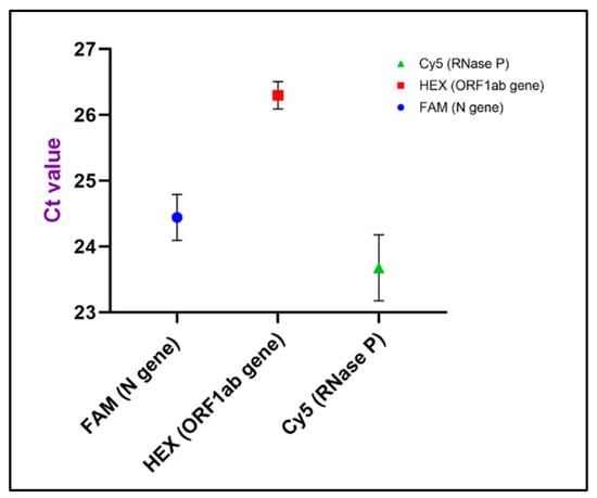 Average Ct values of the 500 CPS standard samples at six replicates using the ultrafast PCR platform. Error bars represent the standard deviation of the 6 replicates.