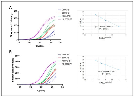 After a standard 42-cycle (including 10 pre-cycles without fluorescence collection) rapid RT-PCR, the fluorescence curves and the linear relationship between Ct value and logarithmic sample concentration (Log10) of N gene (A) and ORF1ab gene (B). The standard samples of SARS-CoV-2 are derived from 10,000, 1000, 500, and 200 copies/mL and perform 3 replicates for each concentration.