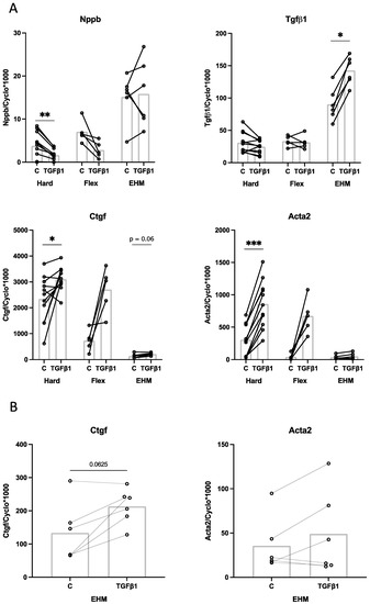 3.6. Effect of TGFβ1 Stimulation on CF Gene Expression in 2D (Monolayer) and 3D (EHM) Cultures