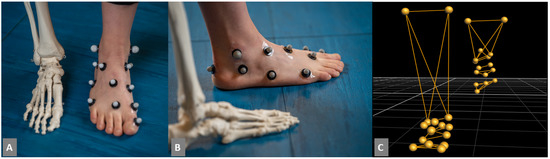(A) and (B) Photograph of reflective marker locations on a participant’s feet, and (C) Single frame image of reconstructed three-dimensional marker trajectories from the Vicon motion capture system.