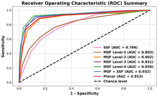 The ROC summary plots were used to compare different combinations of SSF, MSF, and planar feature groups as shown in Figure 2. It was observed that the SSF features performed the worst (AUC = 0.794). The averaged MSF level-1 feature groups had a similar lower performance (AUC = 0.803), however, the performance increased for MSF level-2 (AUC = 0.902) and further for MSF level-3 (AUC = 0.931). The performance plateaued as MSF level-4 did not contribute to a better classification (AUC = 0.930). Similar results were obtained for combining the MSF features with the SSF features (AUC = 0.932), where the performance was similar to MSF level-3. The planar features resulted in lower performance (AUC = 0.913) as compared to the higher-level MSF combinations.
