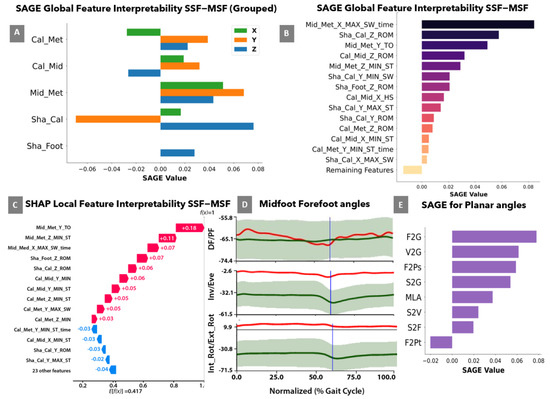 Figure 3D shows the individual MSF kinematic results of participant A14 (shown by the red line) for the Mid-Met segment. The dorsiflexion/plantarflexion, inversion/eversion, and internal/external rotation angles (top-bottom) for the Mid-Met segment are shown in the respective order. The Mid-Met angle shows decreased eversion and increased internal rotation across the entire cycle compared to control data. This result corroborates the findings using SAGE and SHAP plots. Figure 3E illustrates the ranking of planar feature groups using the SAGE grouping values. Results indicate that the F2G feature group had the highest SAGE value (0.08) as compared to other feature groups.