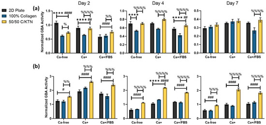 Cell viability and GBA activity were measured, with the latter being normalized to the cell viability at days 2, 4, and 7 post-calcium switch. Ker-CT cells showed no observable increase in GBA activity when calcium was added, as shown in Figure 2a and Table 2. This is possibly due to the immortalized cells behaving similar to cancer cells, which constantly undergo lysosomal biogenesis compared to primary cells [43]. In a previous study on HaCaT cells, an immortalized keratinocyte cell line derived from a tumor showed no increased lysosomal activity when compared to cells activated by calcium [44]. Therefore, their differentiation is not apparent with increase in GBA activity. However, significant (p < 0.01) increases in GBA activity were observed when KTN was added to the collagen hydrogel, as observed in Figure 2a, at days 2 and 4 for all conditions of culture media. The 50/50 C/KTN hydrogels had significantly higher GBA activity than 100% collagen hydrogels, indicating that the presence of KTN increased keratinocyte differentiation.