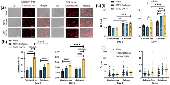 LysoTracker lysosome staining of proliferative and differentiated keratinocytes. Day 2 and day 4 keratinocytes seeded on either a plate or a hydrogel were stained with LysoTracker DND-99 dye to visualize lysosomal distribution, with day 2 shown (a). Fluorescence intensity units (FIUs) of stained lysosomes were measured and normalized to cell viability at days 2 and 4 post-calcium switch (b), with a significant increase observed for 50/50 C/KTN hydrogels compared to the plate and 100% collagen samples with and without calcium (n = 4, weighted average ± SD; * = day 2 vs. 4 for 50/50 C/KTN, # = 2D plate vs. 50/50 C/KTN, % = 100% collagen vs. 50/50 C/KTN). The DL (c) at day 2 showed no significant differences between groups, but increased when calcium was added to the medium (i). Significant increases in DL were observed with 50/50 C/KTN when compared to the plate and 100% collagen at day 4 (n = 60, average ± SEM). Each measurement of DL is also plotted to show the distribution (ii). Two-way ANOVA was performed for both normalized FIU and DL; for all plots. The different symbols (*, #, %) correspond to the comparisons and the number of symbols correspond to the p-value for each comparison: * = p < 0.05, ** = p < 0.01, *** = p < 0.001, **** = p < 0.0001; * = 2D plate vs. 100% collagen, # = 2D plate vs. 50/50 C/KTN, % = 100% collagen vs. 50/50 C/KTN. Scale bar = 100 µm.