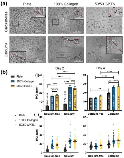Keratinocytes become larger during the differentiation process; therefore, the half-cell length was measured to determine whether the addition of KTN in the hydrogel with the combination of calcium in the medium had any effect in increasing cell size in the form of cell length. As shown in Figure 4A, keratinocytes at day 2 begin to appear larger with calcium in the medium. The half-cell length (HCL) measured from the BF images at day 2 and 4 post-calcium switch is plotted and compared between the different groups in Figure 4B(i). Cells seeded on a plastic plate had significantly lower (p < 0.0001) half-cell lengths than cells seeded on both types of hydrogels, with a significant increase between Ca-free and Ca+ cells observed at day 2 (p < 0.0001). At day 2, the half-cell lengths of cells seeded on top of the plate were less than 19 µm (7.74 ± 0.59); thus, based on the half-cell length, these are considered proliferative cells [37]. Keratinocytes seeded on top of the hydrogels under Ca+ media had average half-cell lengths larger than 19 µm at both time points, indicating that they are in the process of differentiation. A significant increase was observed in cells from Ca-free and Ca+ media seeded on top of 100% collagen and 50/50 C/KTN hydrogels at both day 2 and 4. As shown in Figure 4B(ii), culturing in Ca+ medium led to a wider distribution of half-cell length, indicating that the cells are in the process of differentiation and proliferation.