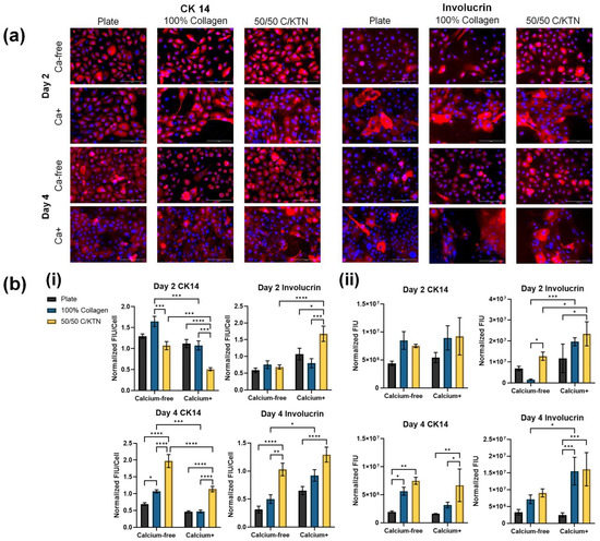 CK14 and involucrin staining and analysis of 2D monolayer samples. Keratinocytes seeded on the plate, 100% collagen hydrogels, and 50/50 C/KTN hydrogels were fixed, permeabilized, and stained for CK14 and involucrin at days 2 and post-calcium switch, with half of the samples still cultured in Ca-free medium (a). Images were analyzed (b) by CTCF of the marker (i) and the total fluorescence intensity per image (ii), which was normalized to the DAPI CTCF and the DAPI cell count, respectively. In general, CK14 was expressed significantly more in Ca-free samples when cells were analyzed individually. Involucrin expression was increased with Ca+ media with significantly higher involucrin expression observed with cells seeded on top of 50/50 C/KTN hydrogels. FIU/cell and total FIU is displayed as average ± SEM and SD, respectively. Two-way ANOVA was conducted with n = 3; * = p < 0.05, ** = p < 0.01, *** = p < 0.001, **** = p < 0.0001. Scale bar = 100 µm.