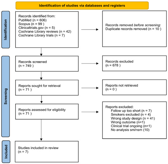 Seven hundred and forty-nine articles were found in the databases (Figure 1). After checking the titles and abstracts, only 71 articles potentially qualified. Seven articles were excluded because the follow-up was too short (less than six months). Four studies were excluded because smokers were not enrolled. Forty-one articles were excluded because of a wrong study design. One article was excluded because the main outcome was not of interest for this research. One study was excluded because it is an ongoing trial, and no provisional results were available from the authors. Ten articles were excluded because they did not provide a separate quantitative analysis for smokers and nonsmokers.