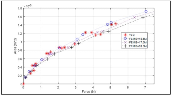 Figure 3 displays the force vs. contact area graph from Finite Element analysis (dashed lines) and test (* marks). The result shows an increasing trend of the area by the increased force. The rate of the contact area to the force (slope) decreases as the force increases, indicating that it becomes harder to make the same change in area as the force is higher. The silicon PDMS sensor’s material properties might vary depending on the curing process. Thus, the area measured by the change in Young’s modulus (±8%) that covers most of the testing points was investigated. This simulation causes the variance of force evaluation from the same contact area. For example, when Young’s modulus is 17.0 MPa (nominal value), the contact force is 1 N by the contact area is 0.51 × 10−6 m2. When Young’s modulus variation is assumed by ±8%, the force measurement changes from 0.90 N~1.11 N (−10%~+11%). This variance increases when the force increases as well: −0.27~+0.12 N (−13.5%~6.0%) from 2 N, −0.22~+0.29 N (−7.3%~+9.6%) from 3 N, and −0.55~0.27 N (−13.7%~+6.7%) from 4 N, respectively. In summary, we observed approximately ±10% variation of force evaluation when there is the uncertainty of material property by ±8% due to errors caused by semi-spheres fabrication process (raw material properties, heating/curing process, and spheres dimension variance), and it covers the range of force from the experimental study. The nominal FEM data (17.0 MPa) follows a second order polynomial, Area (m2) = −1.19 × 10−6 f2 + 2.95 × 10−7 f + 1.98 × 10−7 (f = force in N), and the error to each measured data is also shown in Table 2 (average = 6.54%, standard deviation = 13.30%).