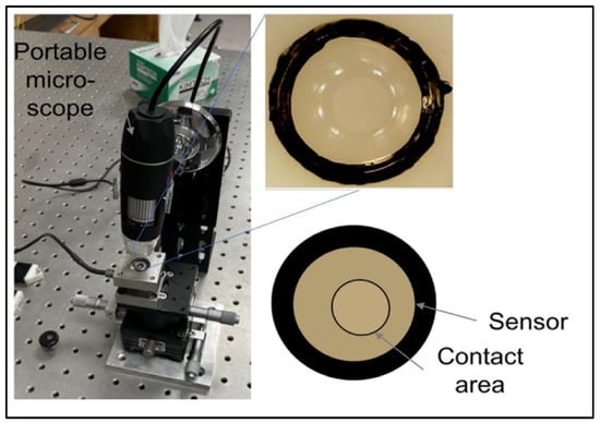 As a first trial, a single semi-sphere sensor was fabricated. The silicon material was cured in the precision mold, and after several trials, a good surface quality was obtained with no bubbles inside. A commercial orthodontic cement Transbond XT (3 M Unitek, Monrovia, CA) is consisted of silane-treated quartz (70–80% by weight), bisphenol-A-diglycidyl ether dimethacrylate (10–20%), bisphenol-A-bis (2-hydroxyethyl) dimethacrylate (5–10%), silane-treated silica (<2%) and diphenyliodonium hexafluorophosphate (<0.2%). Cement to bond the semi-sphere lens on the flat plate that imitates the tooth surface was used, and another transparent flat plate pressures the top of the sensor (ProForm .030” (1 mm) Splint Material) that imitates the clear aligner. The contact area change between the sensor and the top plate was captured by a portable digital microscope (STPCTOU, Model PF018005), as shown in Figure 5.