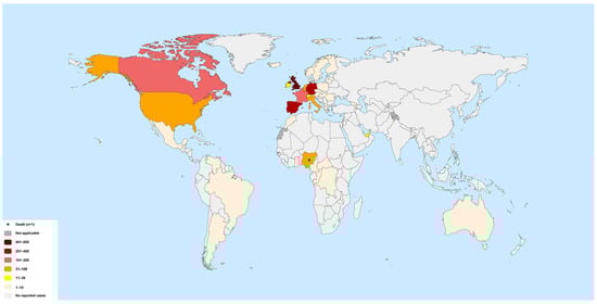 Initially, most of the cases were concentrated in the European region (Figure 1) [25], but the virus is now increasingly spreading to other non-endemic countries. A total of 28 deaths have been reported so far [26]. Among the globally infected countries, countries from the American and European regions are the most affected [26].