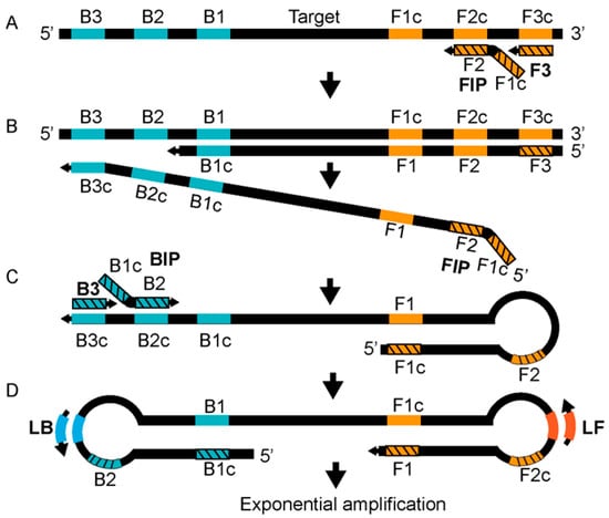 More than ten types of different isothermal amplification methods have been reported and demonstrated for nucleic detection [13]. Loop-mediated isothermal amplification (LAMP) and recombinase polymerase amplification (RPA) are well-explored isothermal nucleic acid amplification based virus detection methods [67]. The LAMP technology relies on two internal primers called the forward internal primer (FIP) and the backward internal primer (BIP), two outer primers known as the forward outer primer (F3) and the backward outer primer (B3), and a DNA polymerase with strand displacement activity [67]. The reaction is carried out at 60–65 °C. The amplification reaction is accelerated by using two loop primers, the forward loop (LF) and the backward loop primer (LB) [68]. The annealing of the FIP, which has two target sequences (separated by a spacer) complementary to the two different regions of the template, initiates strand synthesis and elongation (Figure 4A). Subsequently, the F3 primer displaces the FIP strand, producing a single-stranded DNA (ssDNA) strand that is used as a template by the BIP (Figure 4B). The BIP, which also has two target sequences complementary to the template DNA at two different regions, starts the strand elongation of the ssDNA template, which is later displaced by the B3 (Figure 4C). The 5′ and 3′ ends of the template DNA have inward complementary sequences, forming a stem-looped DNA that is exponentially amplified by loop primers (Figure 4C,D). LAMP-based MPXV-clade-specific assays have been developed where West African (the assay named W-LAMP) and Congo Basin MPXV (the assay named C-LAMP) clades are selectively detected [69]. A turbidimeter is used to analyze the LAMP reaction, and restriction digestion is used to confirm the LAMP products. A LAMP-based method for rapid MPXV detection was recently posted on a preprint server [70]. The assay was developed to detect MPXV clades. The method shows satisfactory sensitivity and response times.