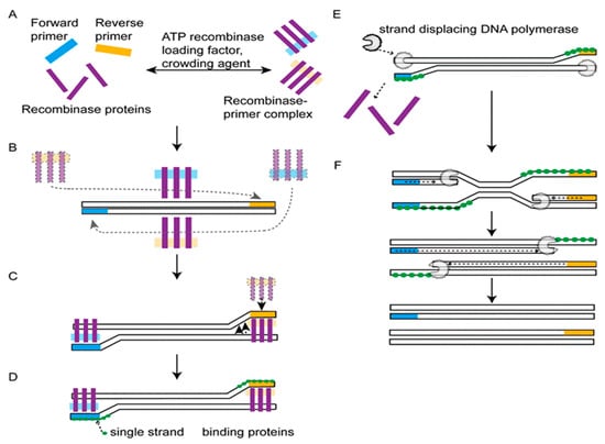 Reaction mechanism of RPA. Recombinase complexation with primer (A). Scanning of homologous sequences by recombinase–primer complex (B). Strand displacement by recombinase and primer insertion (C) and binding of single-strand-binding proteins to stabilize the primer binding (D). Recombinase disassembly and binding of strand-displacing DNA polymerase (E). Elongation reaction (F). Adapted from Ref. [71] with permission from Elsevier. Copyright © 2017 Elsevier B.V.