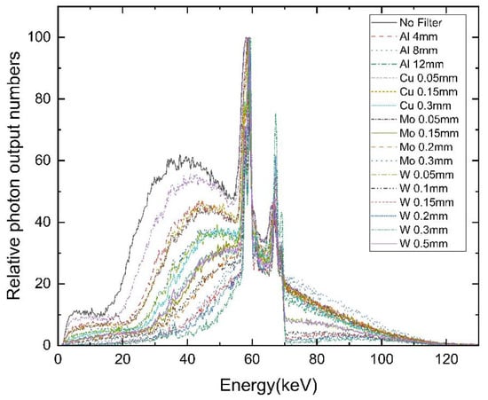 X-ray spectrum from Al, Cu, Mo, W, and no filter at 100 kV.