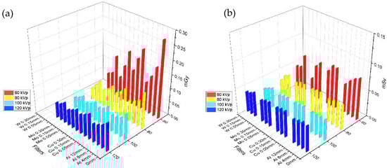 The entrance dose on the X-ray receptor sensor was maintained using the AEC. The experimental results according to the tube voltage and filter thickness are presented in Figure 2a. The dose value of the vertical axis is not an absolute value optimized for pediatric chest radiography but a relative value for comparing entrance skin doses by tube voltage and filters. As the thicknesses of the Al, Cu, Mo, and W filters increased, the entrance skin dose decreased gradually at 100 kVp. Thus, as the thickness of the filter increased, the overall entrance skin dose decreased; however, as the tube voltage increased, the dose reduction effect decreased, and when it reached 120 kVp, the entrance skin dose increased. When compared to the tube voltage of 100 kVp, the entrance skin dose was 1.0, in the absence of a filter. The entrance skin dose was reduced as follows: Al 4 mm, 0.77; Cu 0.05 mm, 0.85; Mo 0.05 mm, 0.73, and W 0.05 mm, 0.68, indicating that the dose reduction effect of the W filter was the greatest.