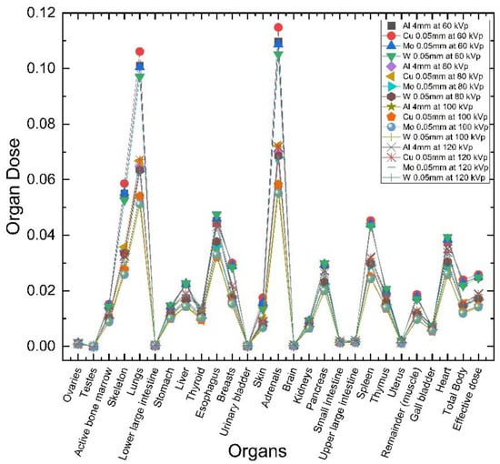 Organ absorbed dose result using various filters (Al, Cu, Mo, W, and no filter) at 60, 80, 100, and 120 kVp.